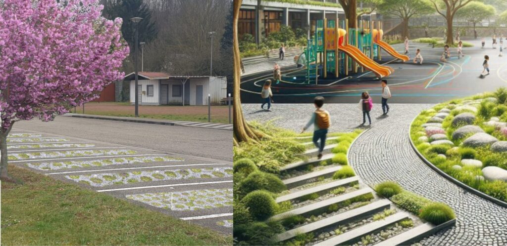 Végétalisation des cours d’écoles, plantation d’arbres, blocs perméables et drainants sur les parkings … Stop au tout béton !
